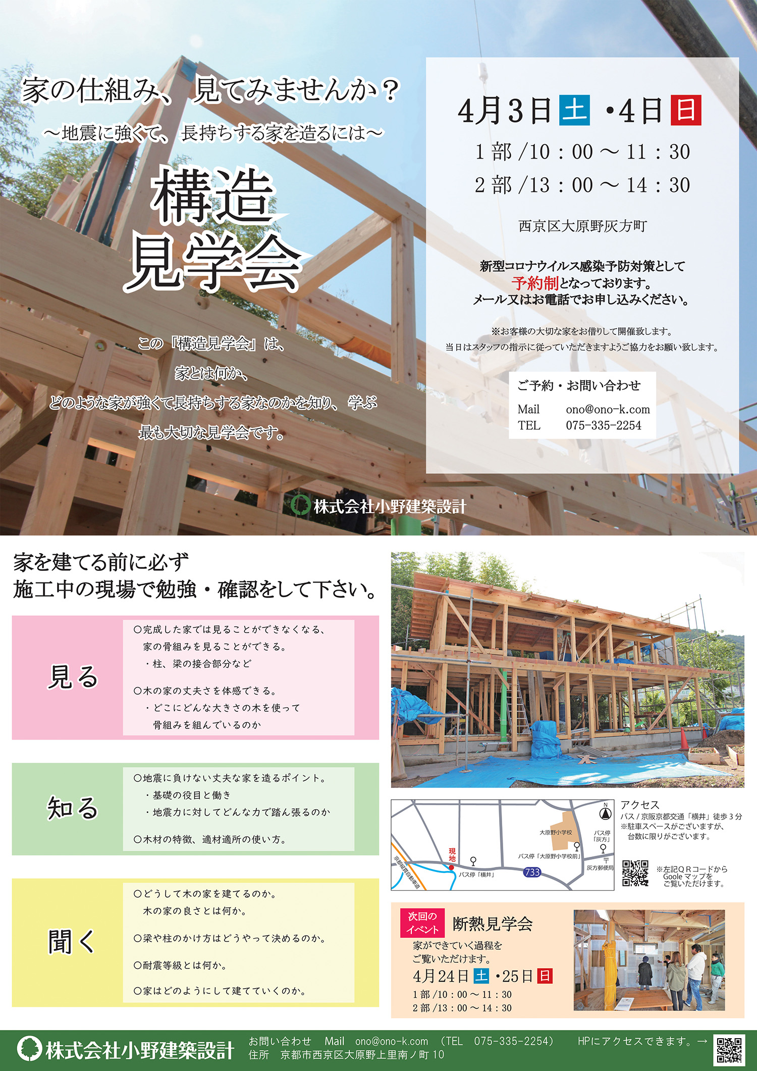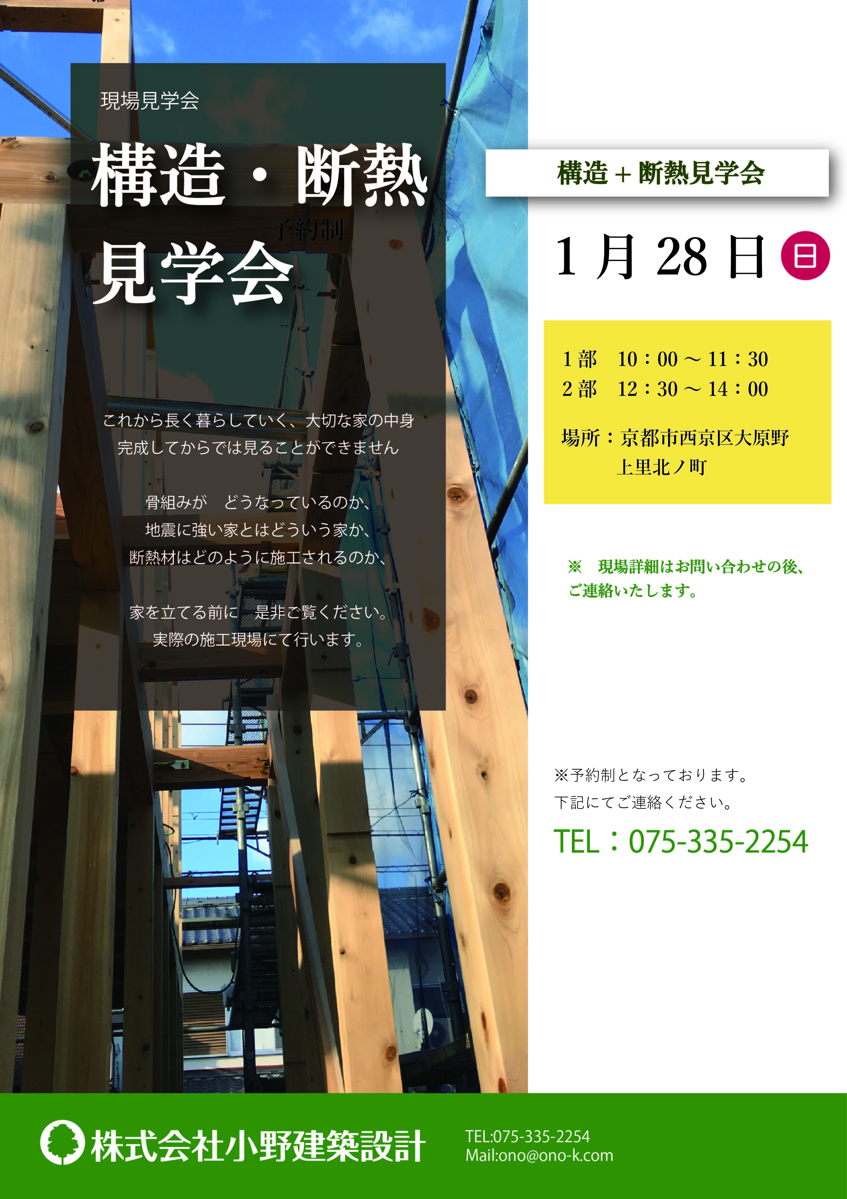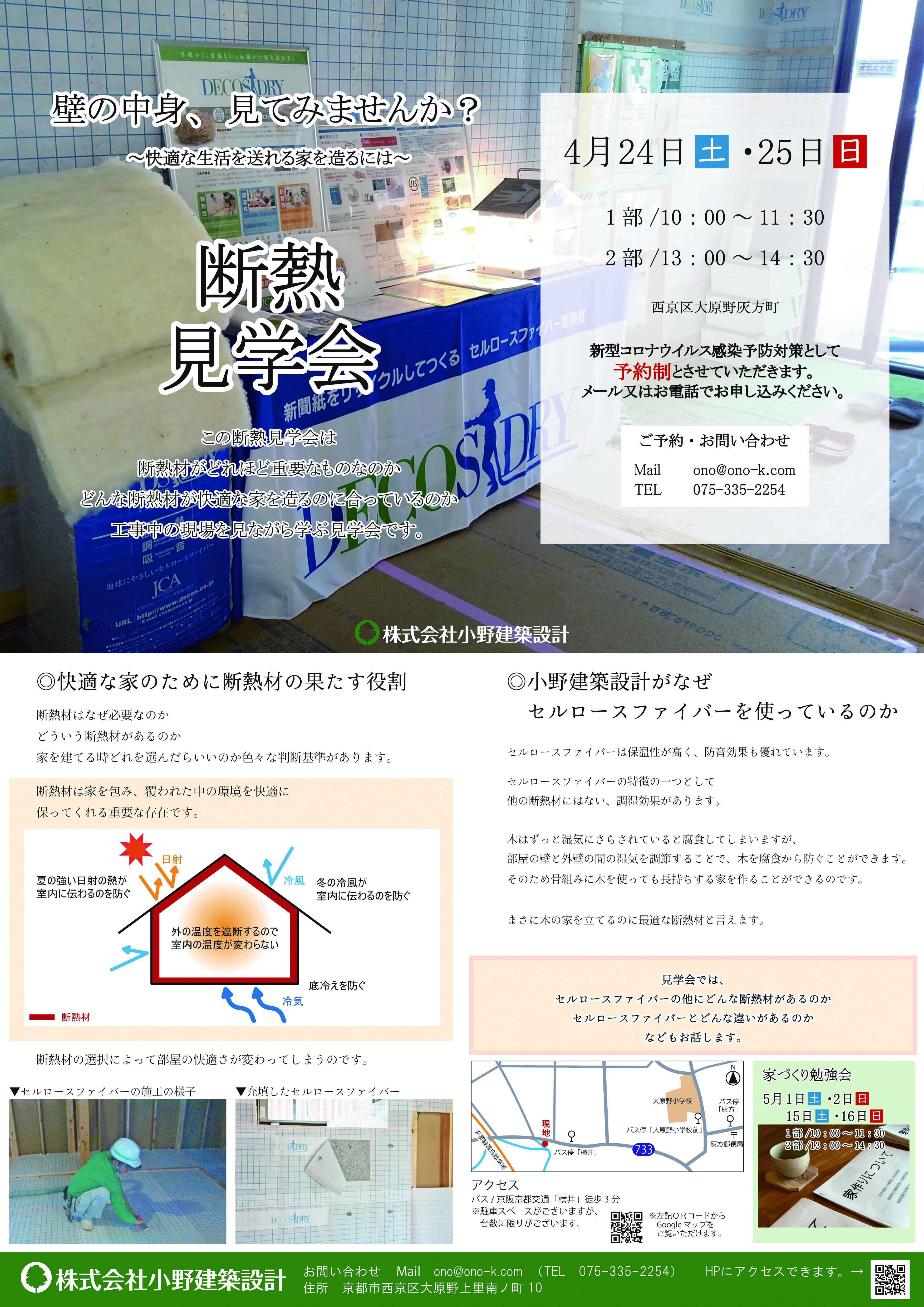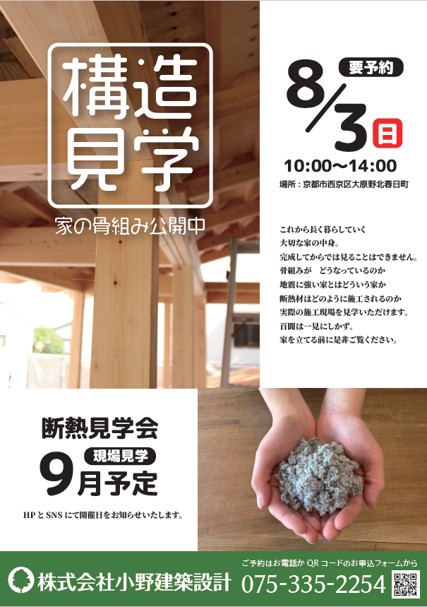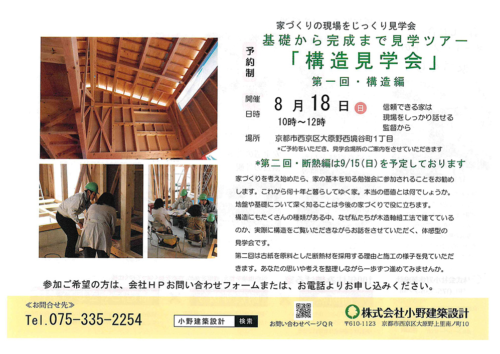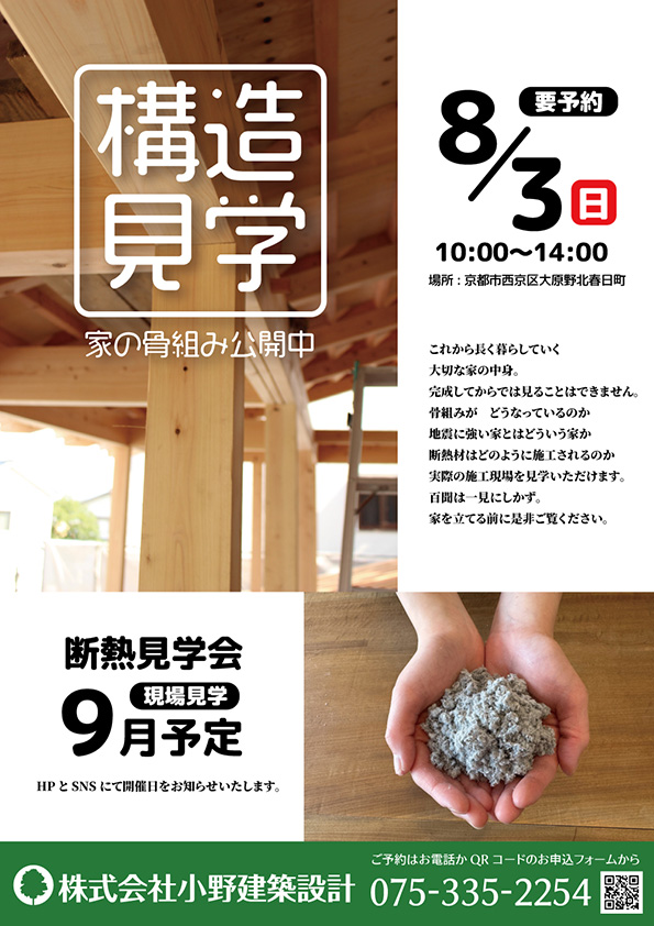 工事途中の構造や、断熱をご覧いただける見学会を予定しています。ぜひご来場ください。
