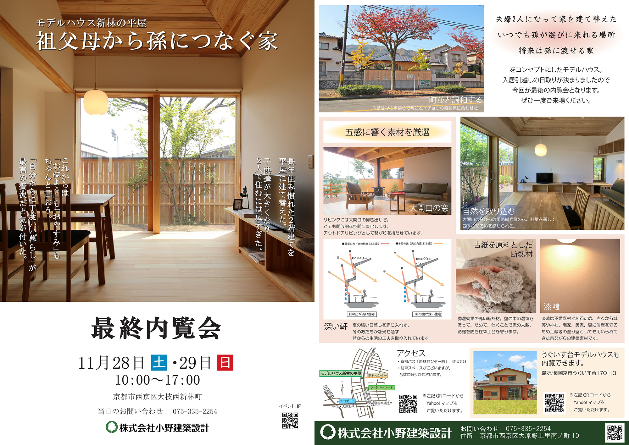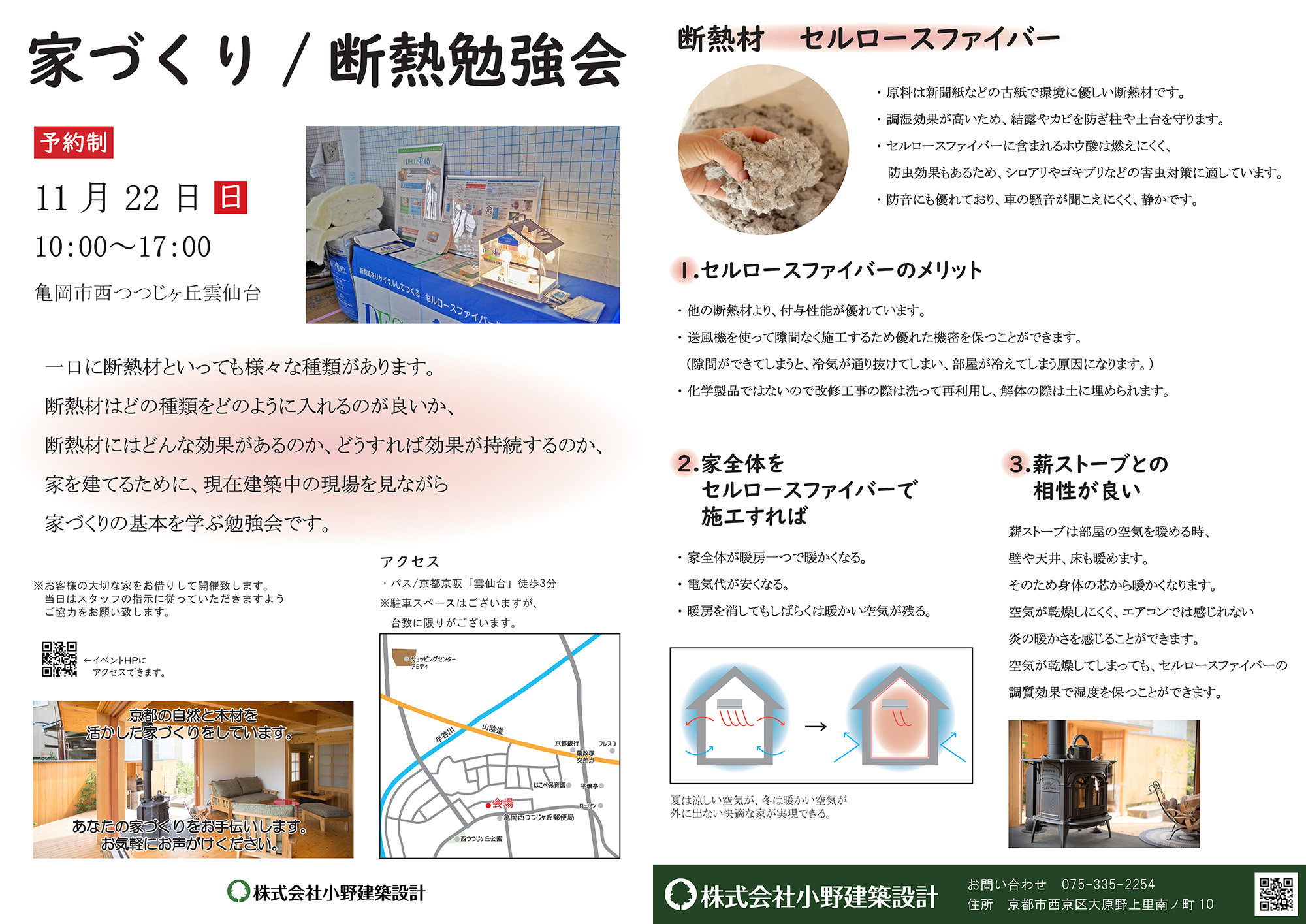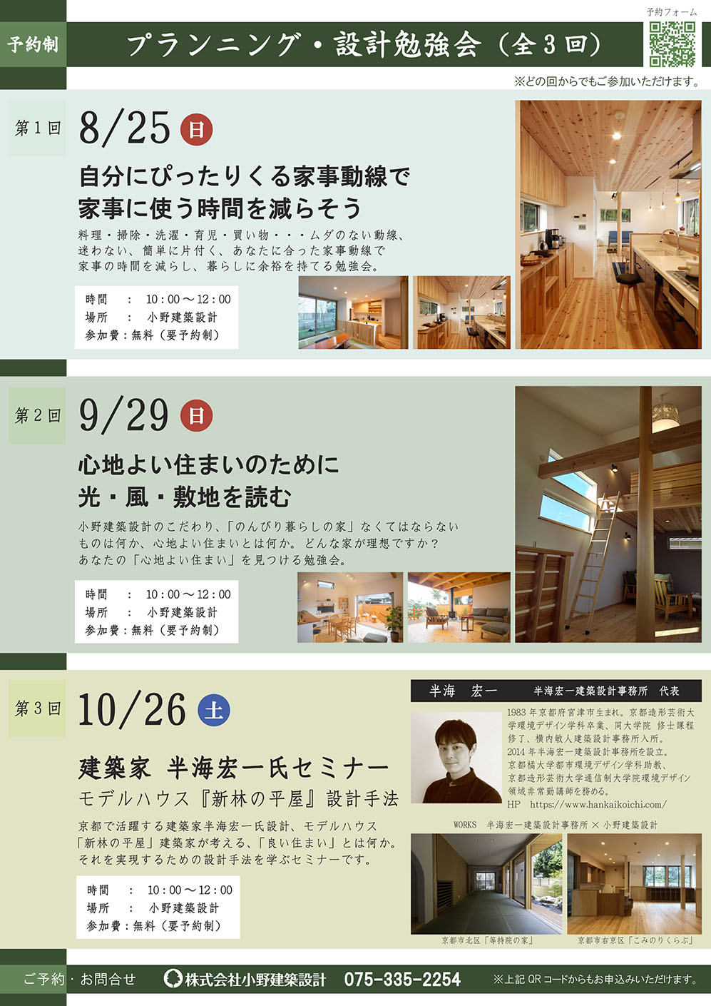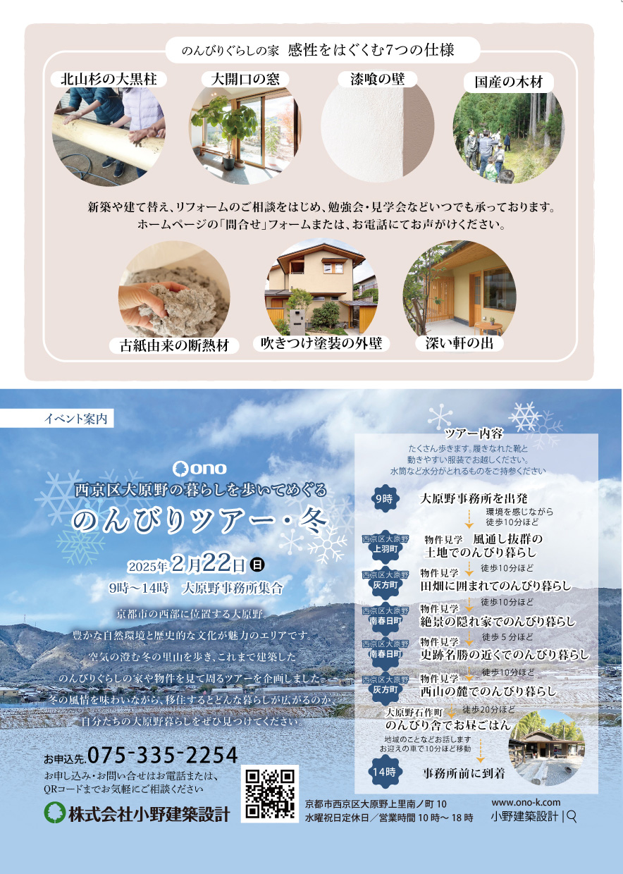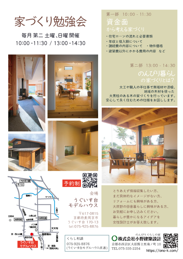 時間:第1部 10:00〜11:30「土地・資金計画と準備」、第2部 13:00〜14:30「小野建築設計の家づくり」