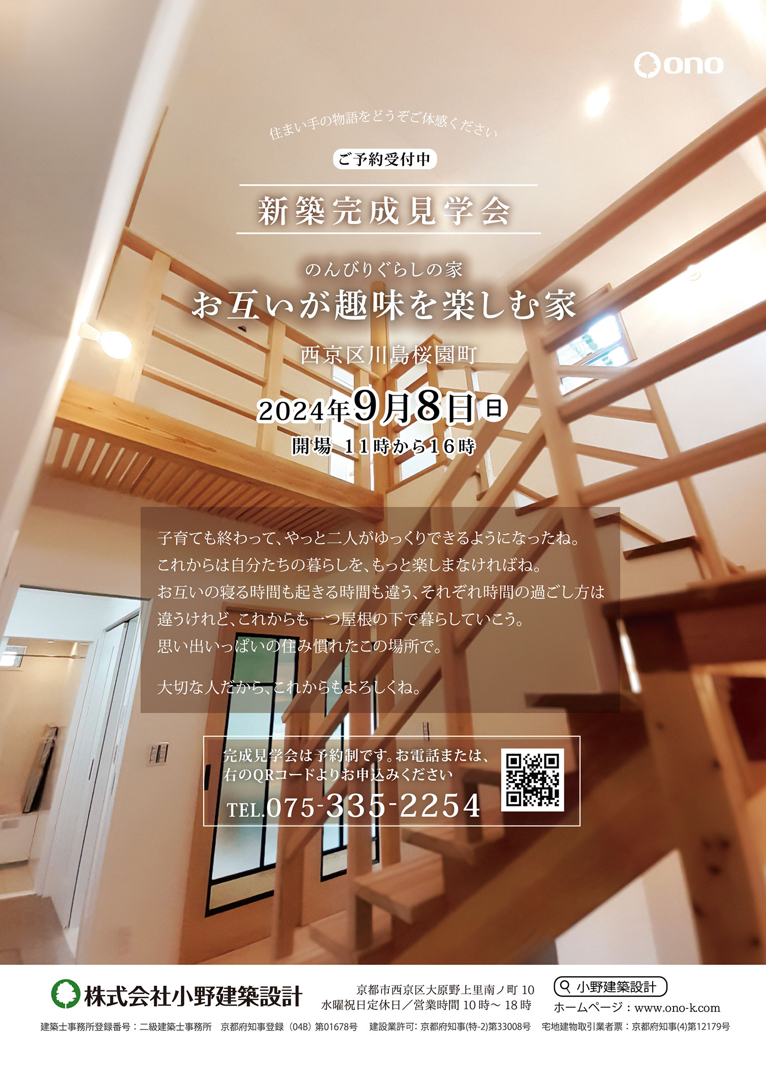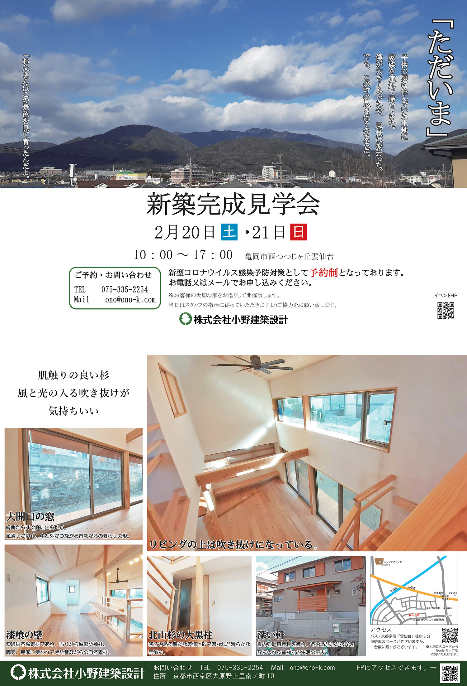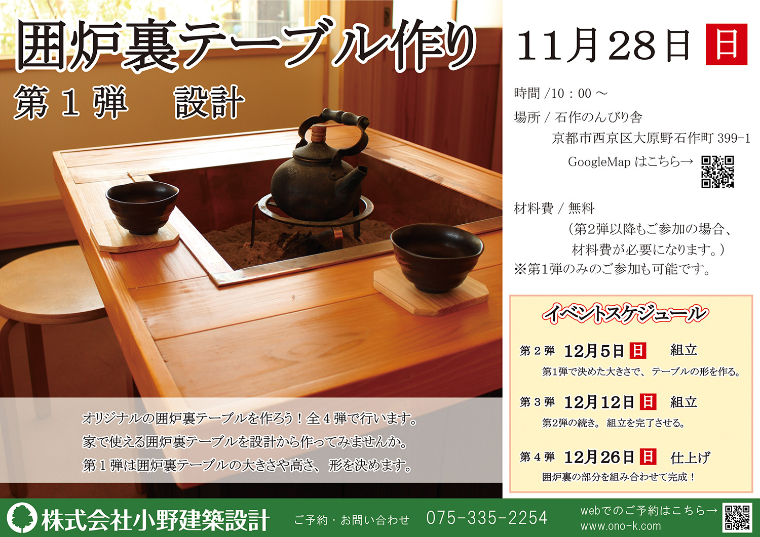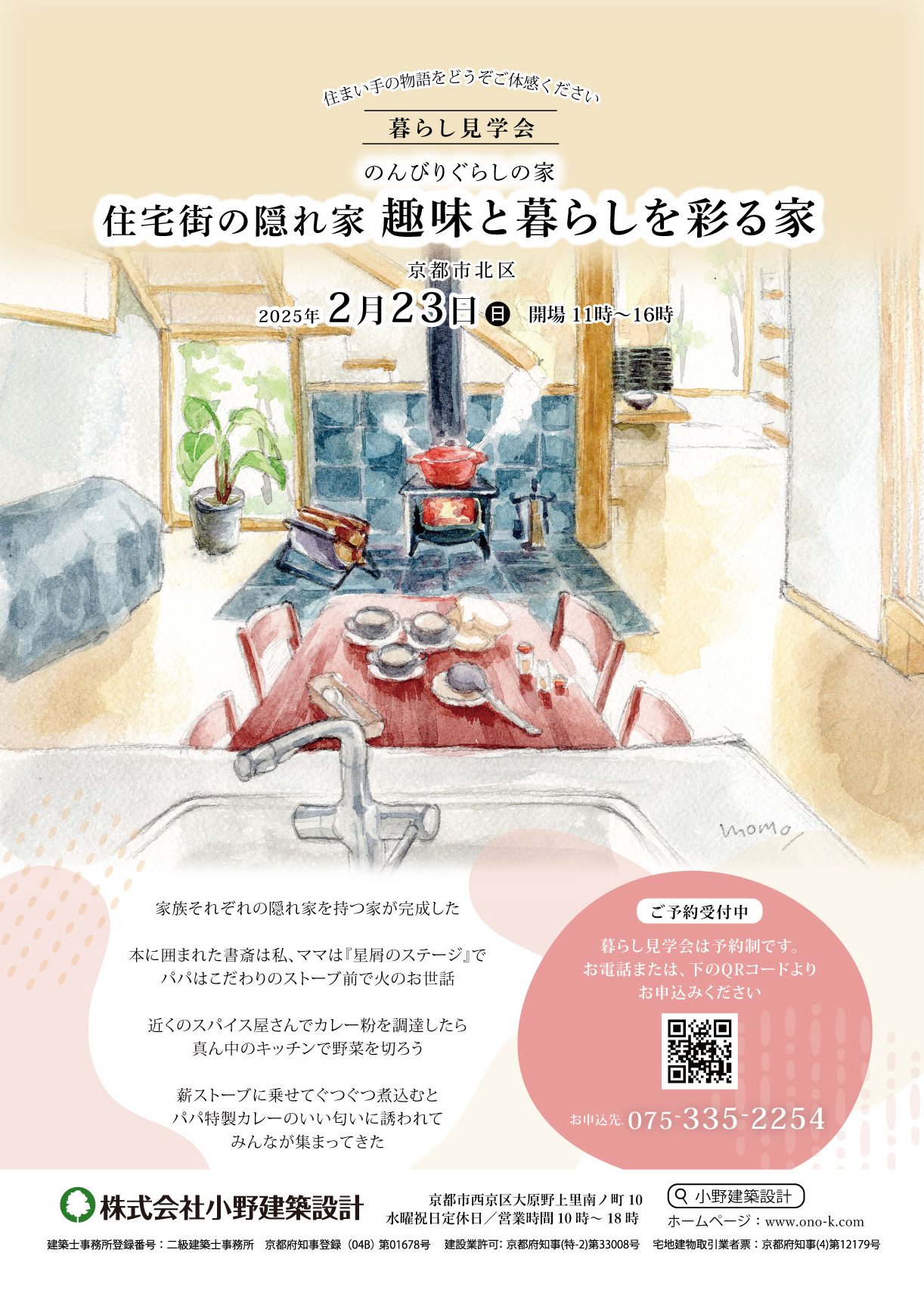 時間:第1部 10:00〜11:30「土地・資金計画と準備」、第2部 13:00〜14:30「小野建築設計の家づくり」