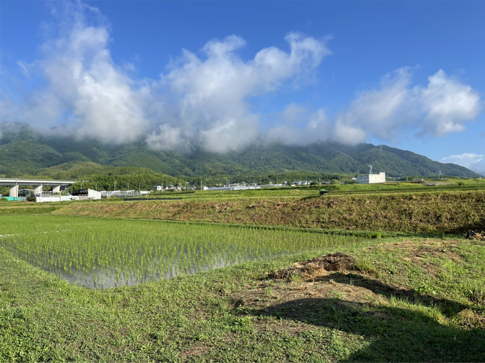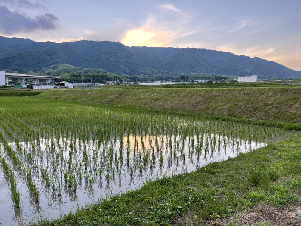 うぐいす台モデルハウスから西を眺めると、苗代に苗が植わり、青空の下には西山が眺められます。