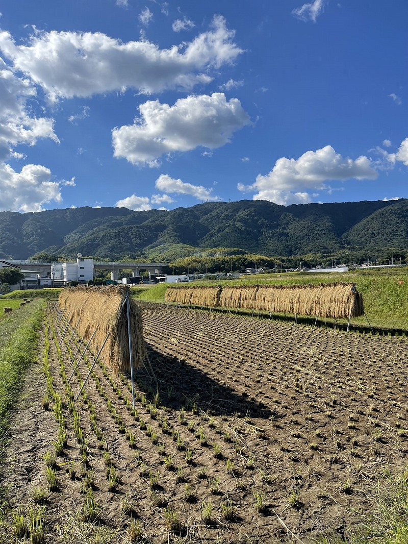 刈り取った稲を一生懸命一輪車に乗せて運ぶ子供の体力にはついて行けませんでしたが、お米をよりおいしくするためにお天道様にお願い中です。